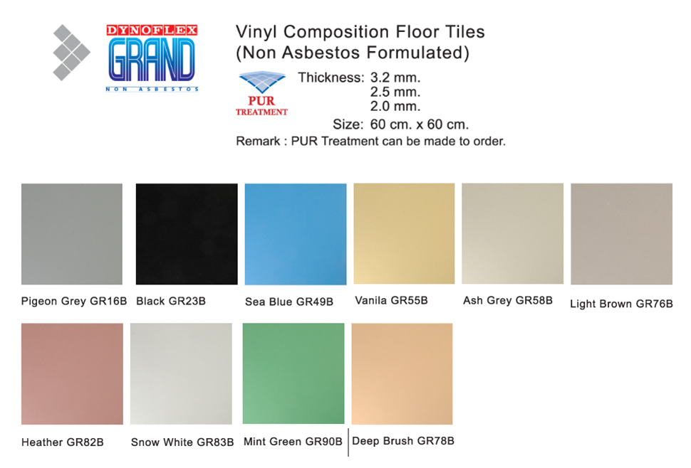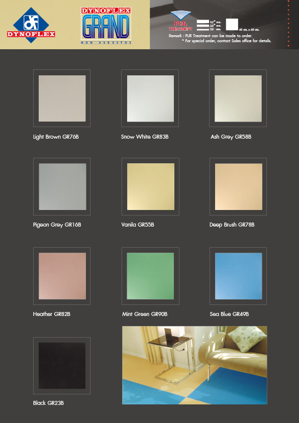 กระเบื้องยางไดโนเฟล็กซ์ รุ่น GRAND กระเบื้องไวนิล รุ่น Grand ขนาด 60 x 60 cm.หนา 2.0/2.5 mm. *ความหนา 3.2 mm.สินค้ายกเลิกผลิตนะคะ* 60 x 60 cm. ความหนา 2.0 mm. 4GR-xx /1 กล่อง = 15 แผ่น/ปูได้ 5.4 ตรม. ราคาปรกติ 350 บาท/ต่อตรม. กล่องละ 1,890 บาท **ลดเหลือ 304.95/ต่อตรม.*ราคาที่ลงโฆษณาในเว็บไซต์เป็นราคาต่อตารางเมตร *สินค้าจำหน่ายยกกล่อง กล่องละ 1,646.73 บาท *สอบถามรายละเอียดเพิ่มเติมได้ที่โชว์รูมในวันและเวลาทำการนะคะ 60 x 60 cm. ความหนา 2.5 mm. 5GR-xx /1 กล่อง = 12 แผ่น/ปูได้ 4.32 ตรม. *ราคา xxx บาท/กล่อง *สินค้าสั่งผลิตมีจำนวนเท่านั้น สอบถามราคา & รายละเอียดเพิ่มได้ที่โชว์รูมในวันและเวลาทำการนะคะ - แนะนำใช้กับกาวไดโนกลู Dynoglue กาวแท้จากโรงงาน(โรงงานรับประกันสินค้ากรณีใช้กาวแท้เท่านั้นนะคะ) - ราคาขายส่ง ถูกกว่าห้างฯ และถูกกว่าซื้อตรงโรงงานค่ะ - บริการจัดส่งฟรี กทม.เมื่อสั่งซื้อครบ 2 กล่องขึ้นไปนะคะ - ลูกค้าตจว. ส่งผ่านขนส่งในกทม.(ลูกค้าชำระเองค่าขนส่งปลายทาง) - สั่งซื้อจำนวนมากต่อออร์เดอร์ สอบถามส่วนลดโครงการเพิ่มเติมได้ที่พนักงานขายนะคะ