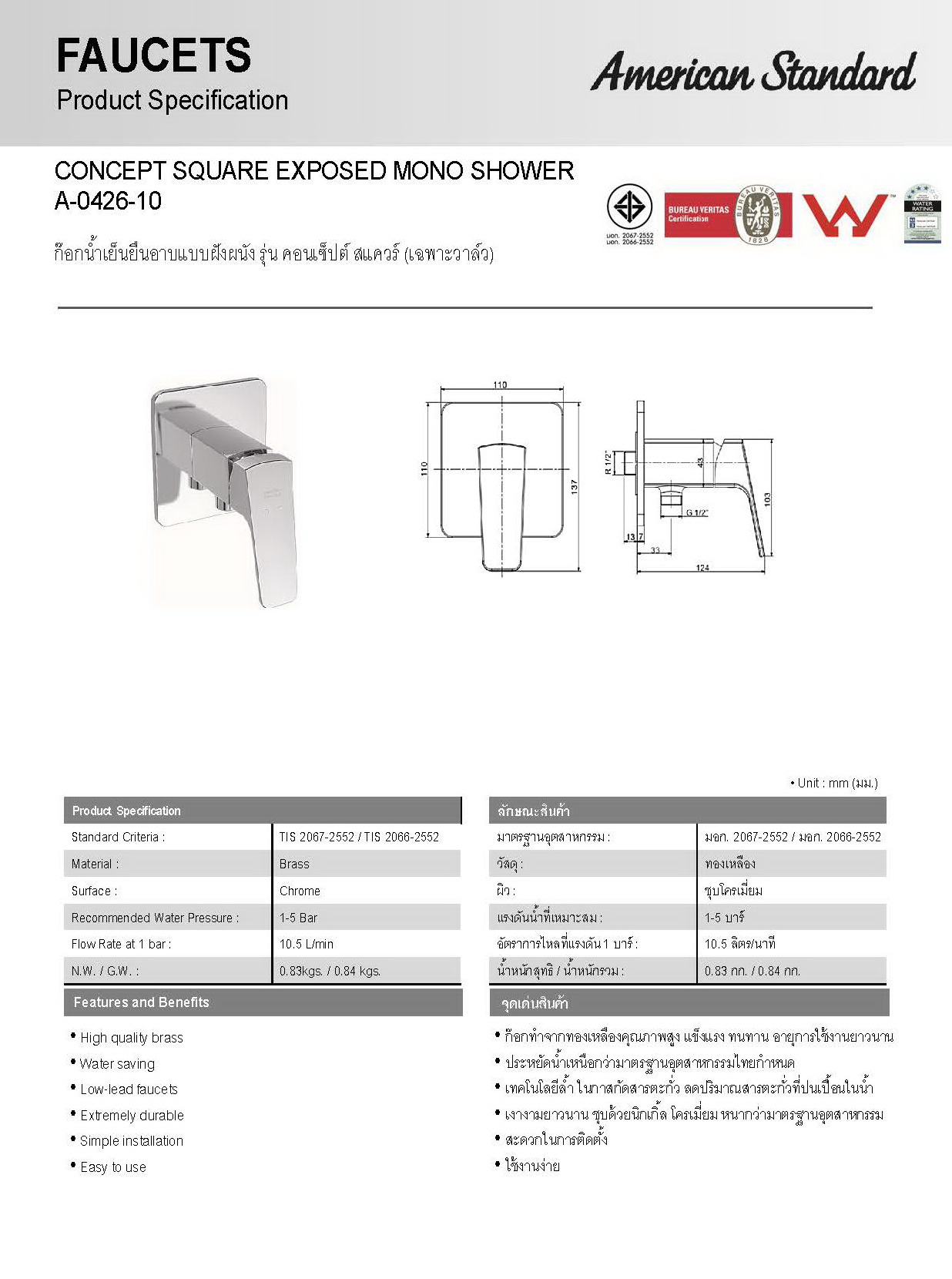 A-0426-10 ก๊อกน้ำเย็นยืนอาบแบบฝังผนัง รุ่น Concept Square (เฉพาะวาล์ว)