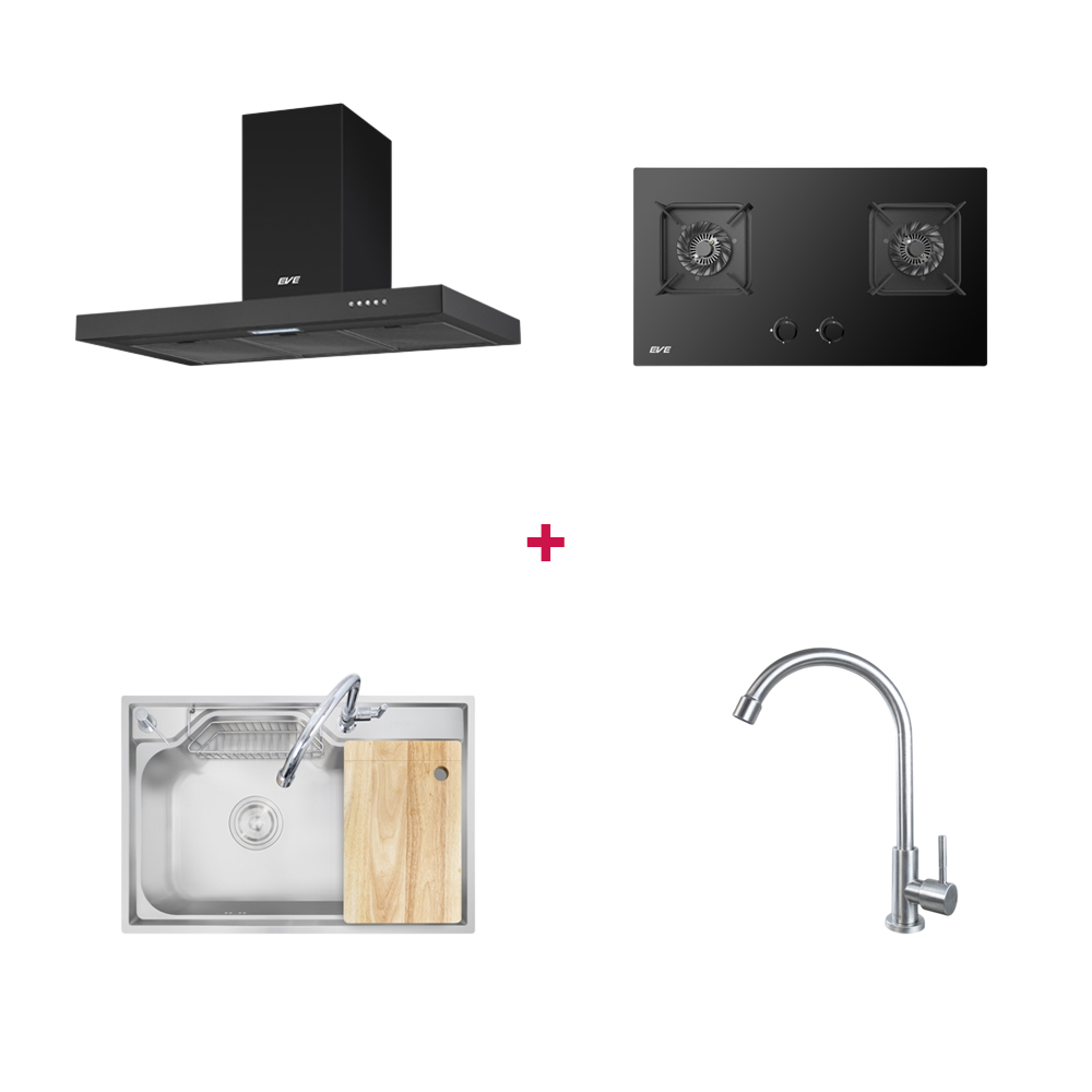 EVE SET เครื่องดูดควันติดผนัง + เตาแก๊ส 2 หัว แบบฝัง ฐานกระจก + ซิงค์ล้างจานอเนกประสงค์ + ก๊อกซิงค์ล้างจาน