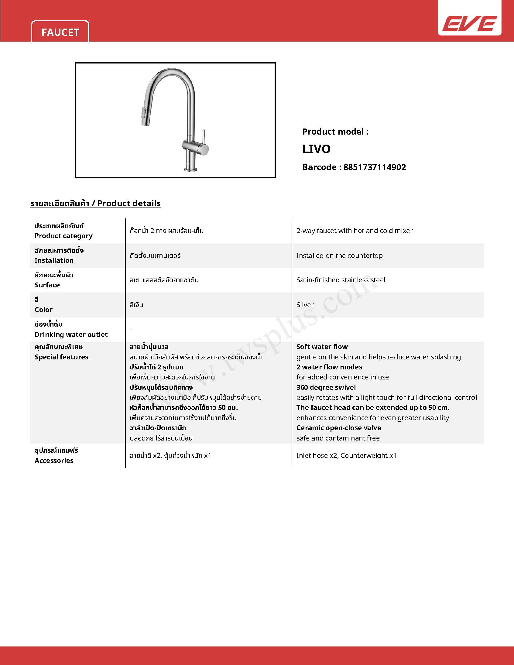 EVE ก๊อกน้ำอ่างล้างจาน ก๊อกน้ำผสม ร้อน-เย็น LIVO EVE ก๊อกน้ำอ่างล้างจาน ก๊อกน้ำผสม ร้อน-เย็น LIVO